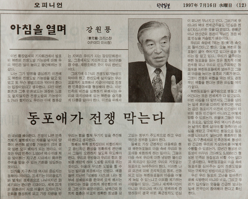 아침을 열며 : 동포애가 전쟁 막는다 작성일 : 2011.06.29 조회수 : 14 공유하기 페이스북으로 공유하기 페이스북으로 공유하기 URL 북한동포들이 굶주림으로 병들고 죽어간다는 것을 알면서도 돕지 못하면 동포이기 이전에 인간성이 마비된 병든 인간들이다. 우리 역사가 존속되는 날까지 함께 살아야 할 동족이란 사실을 깨닫고 구체적인 행동으로 동포애를 나타내지 않는다면 평화적인 통일, 민족공동체 형성은 수행할 수 없다. 관련일시 1997.07.16 노트 한국일보 태그 신문기사 이전 한신대 신입생을 위한 내일&리더십 캠프 다음 1차 멘토 포럼 목록으로