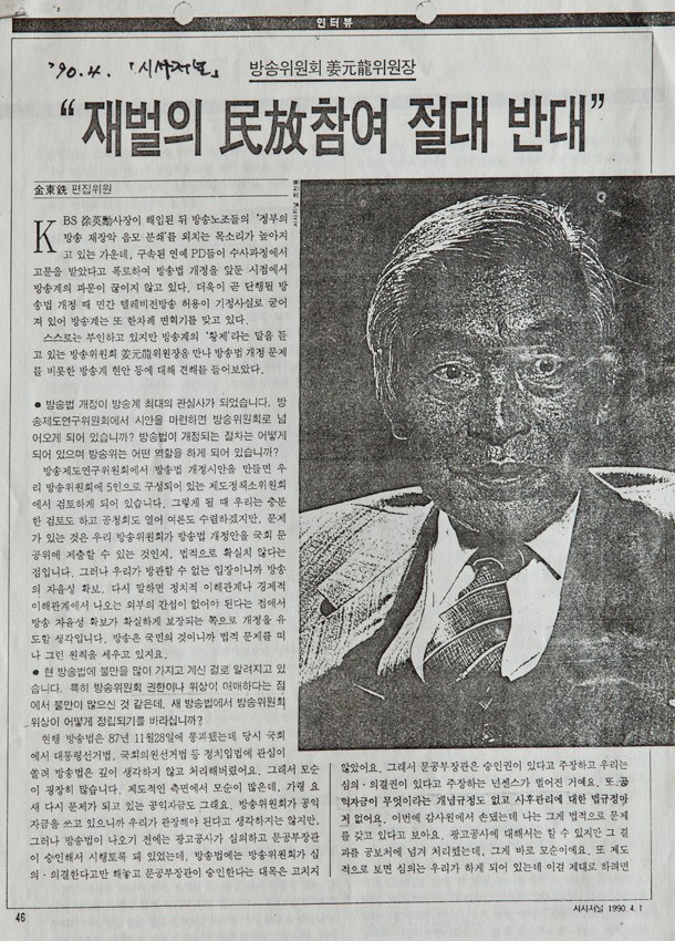 한국에 공영방송만 있어야 된다고 생각지는 않지만, 민간방송이 재벌이나 재벌들에 의해서 운영되는 것은 절대로 반대한다. 민간방송에 재벌이 끼어드는 것은 권력개입보다 더 나쁘고 방송에서 시청자인 국민에 대해 주권침해가 있어서는 안 된다.