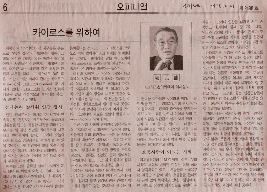 오피니언 : 카이로스를 위하여 작성일 : 2011.06.29 조회수 : 14 공유하기 페이스북으로 공유하기 페이스북으로 공유하기 URL 그리스 신회에 나오는 말로 크로노스는 직선적으로 계속되는 캘린더적 시간이지만, 카이로스는 역사의 한 시기에 연속적으로 전진하는 크로노스에 돌입해서 전환점을 만드는 특정한 시간을 가리킨다. 우리는 새천년 첫날을 카이로스의 시간으로 받아들여야 한다. 관련일시 1999.12.31 노트 문화일보 태그 신문기사 이전 한신대 신입생을 위한 내일&리더십 캠프 다음 1차 멘토 포럼 목록으로