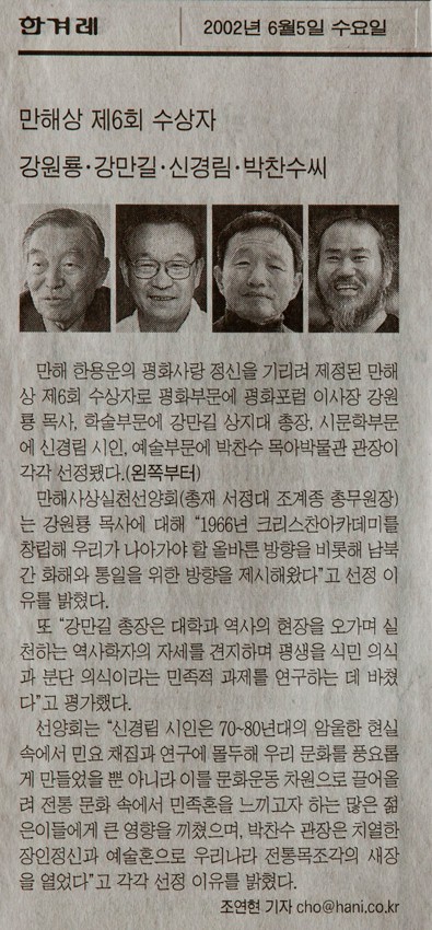 만해상 제6회 수상자 작성일 : 2011.06.29 조회수 : 15 공유하기 페이스북으로 공유하기 페이스북으로 공유하기 URL 만해 한용운의 평화사랑 정신을 기리려 제정된 만해상 제6회 평화부문 수상자로 “1966년 크리스챤아카데미를 창립해 우리가 나아가야 할 올바른 방향을 비롯해 남북간 화해와 통일을 위한 방향을 제시해왔다”는 선정이유로 평화포럼 강원용 이사장을 선정했다. 관련일시 2002.06.05 노트 한겨레 태그 신문기사 이전 한신대 신입생을 위한 내일&리더십 캠프 다음 1차 멘토 포럼 목록으로