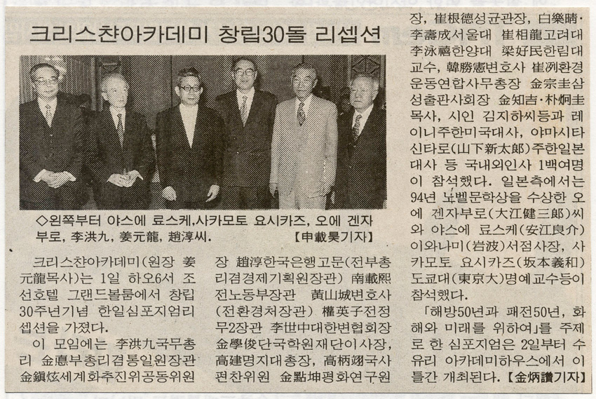 크리스챤아카데미 창립30돌 리셉션 작성일 : 2011.06.29 조회수 : 17 공유하기 페이스북으로 공유하기 페이스북으로 공유하기 URL 크리스챤아카데미 (원장 강원용 목사)는 1일 조선호텔 그랜드볼룸에서 창립 30주년기념 한일 심포지엄 리셉션을 가졌다. “해방50년, 패전50년-화해와 미래를 위하여”를 주제로 한 심포지엄은 수유리 아카데미하우스에서 이틀간 개최된다. 관련일시 1995.02.02 노트 한국일보 태그 신문기사 이전 한신대 신입생을 위한 내일&리더십 캠프 다음 1차 멘토 포럼 목록으로