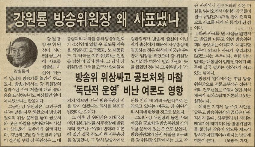 강원용 방송위원장 왜 사표냈나 작성일 : 2011.06.29 조회수 : 13 공유하기 페이스북으로 공유하기 페이스북으로 공유하기 URL 강 위원장의 돌연 사퇴 배경은 공보처와 방송위원회 간의 위상 문제에 있는 것으로 보인다. 방송위원회의 완전 독립을 요구해 온 강 위원장 입장에서는 크고 작은 사안에서 공보처와의 잦은 마찰을 빚어오면서 유임된 지 4개월 만에 전격적으로 사표를 내게 된 동기가 되었다. 관련일시 1991.03.13 노트 한겨레 태그 신문기사 이전 한신대 신입생을 위한 내일&리더십 캠프 다음 1차 멘토 포럼 목록으로