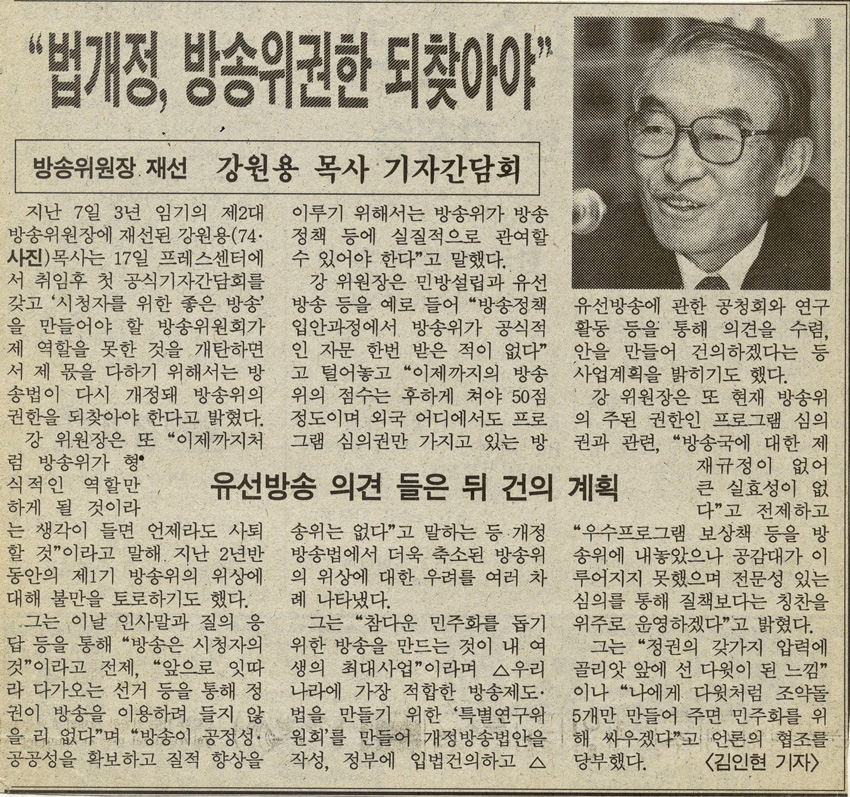 방송위원장 재선 강원용 목사 기자간담회 작성일 : 2011.06.29 조회수 : 13 공유하기 페이스북으로 공유하기 페이스북으로 공유하기 URL 지난 7일 3년 임기의 제2대 방송위원장에 재선된 강원용 목사는 17일 프레스센터에서 취임후 첫 공식기자간담회를 갖고 ‘시청자를 위한 좋은 방송’을 만들어야 할 방송위원회가 제 역할 못한 것을 개탄하면서 제몫을 다하기 위해서는 방송법이 다시 개정돼 방송위의 권한을 되찾아야 한다고 밝혔다. 노트 한겨레 태그 신문기사 이전 한신대 신입생을 위한 내일&리더십 캠프 다음 1차 멘토 포럼 목록으로